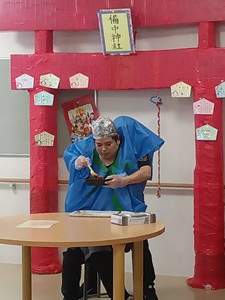 1月14日、協力ユニットごとに新年会を開催しました。 備中神社にお参りし、ユニット職員による出し物、