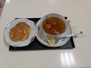 おやつ作りで、『梨入りホットケーキ 紅茶を添えて』を